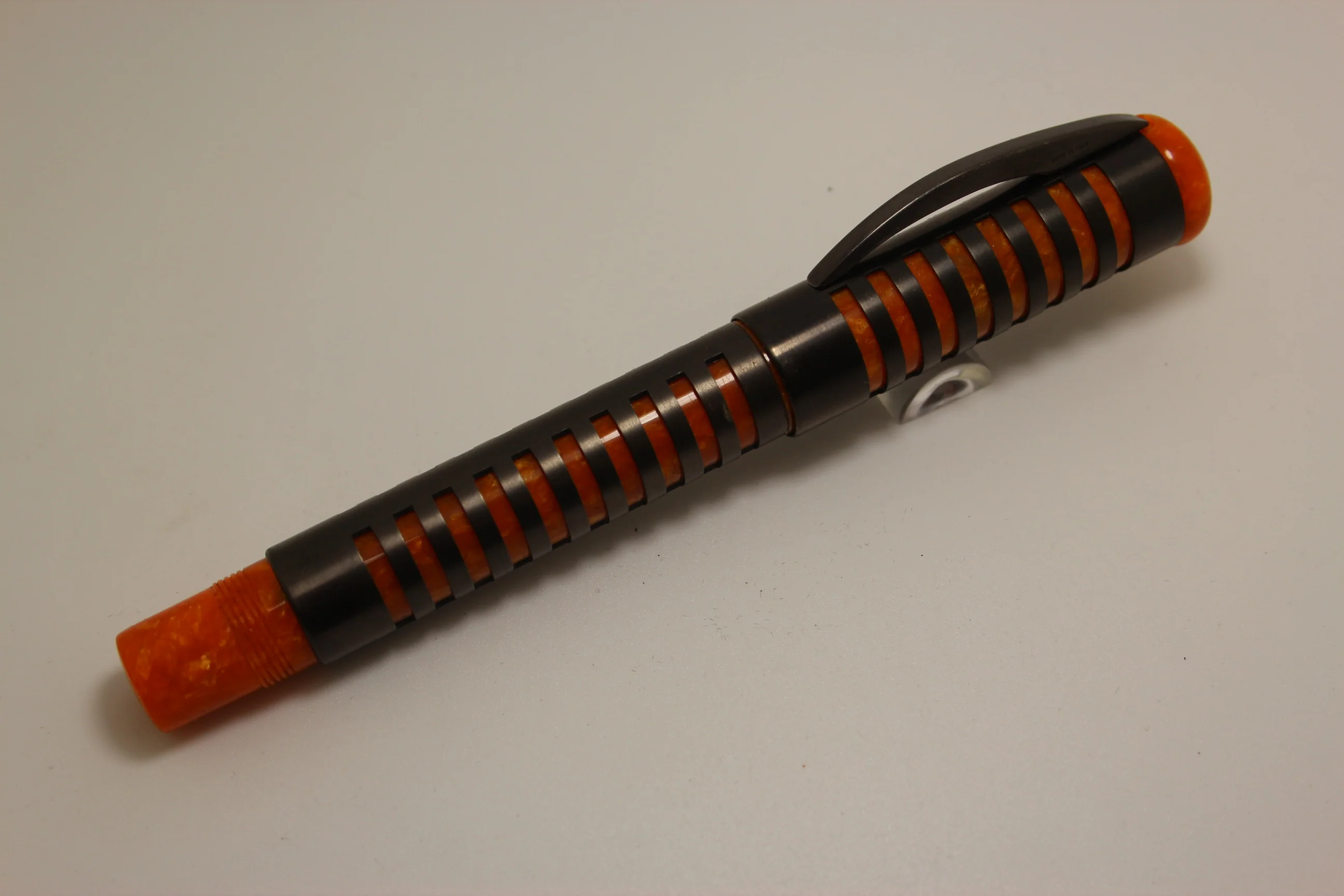 The translucent resin allows for direct viewing of the piston filling mechanism and nib through the Skeleton overlay for the fountain pen as well as a view for the inner workings and mechanism for the ballpoint and capped rollerball. The Dolcevita Skeleton collection utilizes Delta’s signature orange resin found on the best selling Dolcevita series. The black rhodium cage frames the brightly colored resin perfectly, creating a sleek, modern design.
