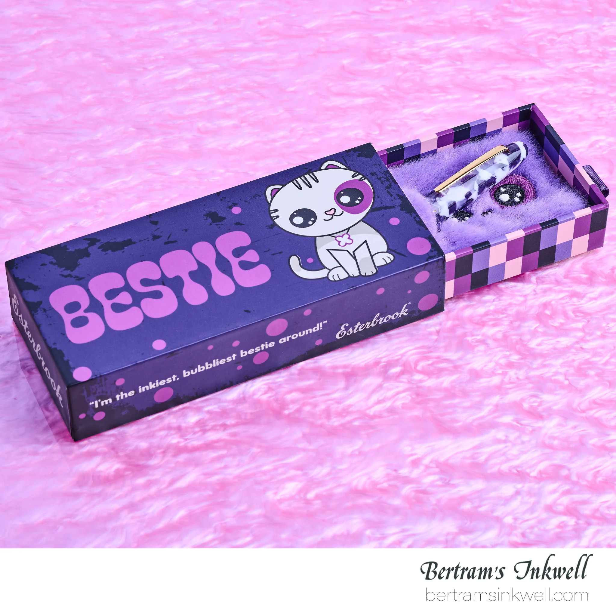 Crafted from acrylic, each pen features natural variation, ensuring no two Besties are exactly alike. With a familiar balance and comfortable weight, these pens are perfect for journaling, long writing sessions, or everyday use. Each Bestie pen is housed in a playful drawer-style box with a soft, furry “bed” inside for a charming unboxing experience.