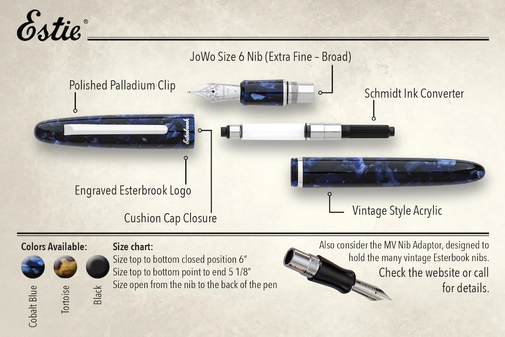 This new Esterbrook Estie has a warm honey polished acrylic barrel and cap. This new edition to the Estie family also has there cushion cap closure to keep the nib from drying out. Esterbook began manufacturing nibs in the US in the mid 1800s, but the 1930s were a period of importance, as they introduced their first interchangeable nib system in 1933. The interchangeable nibs gave the user many options for writing, whether in school, business, personal etc. Today, a similar system is reborn with the Estie and the specially engineered MV Nib Adaptor. The MV adaptor delivers a vintage nib experience with a modern shape Esterbrook pen.