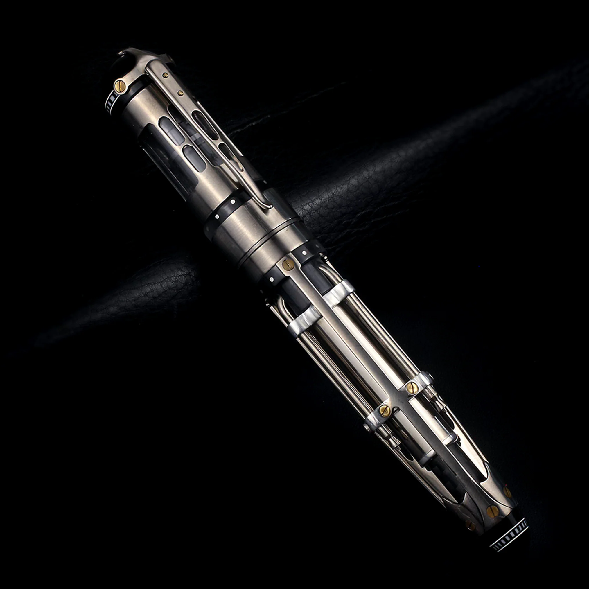 Crafted of high-grade titanium and a rich gray pearl acrylic, the Steampunk Titanium Carbon Fiber features a tapered cylindrical barrel matched with a rounded cap. The cap is made with clear acrylic under a titanium overlay and mounts a clean, tapered clip design secured with brass machine screws.