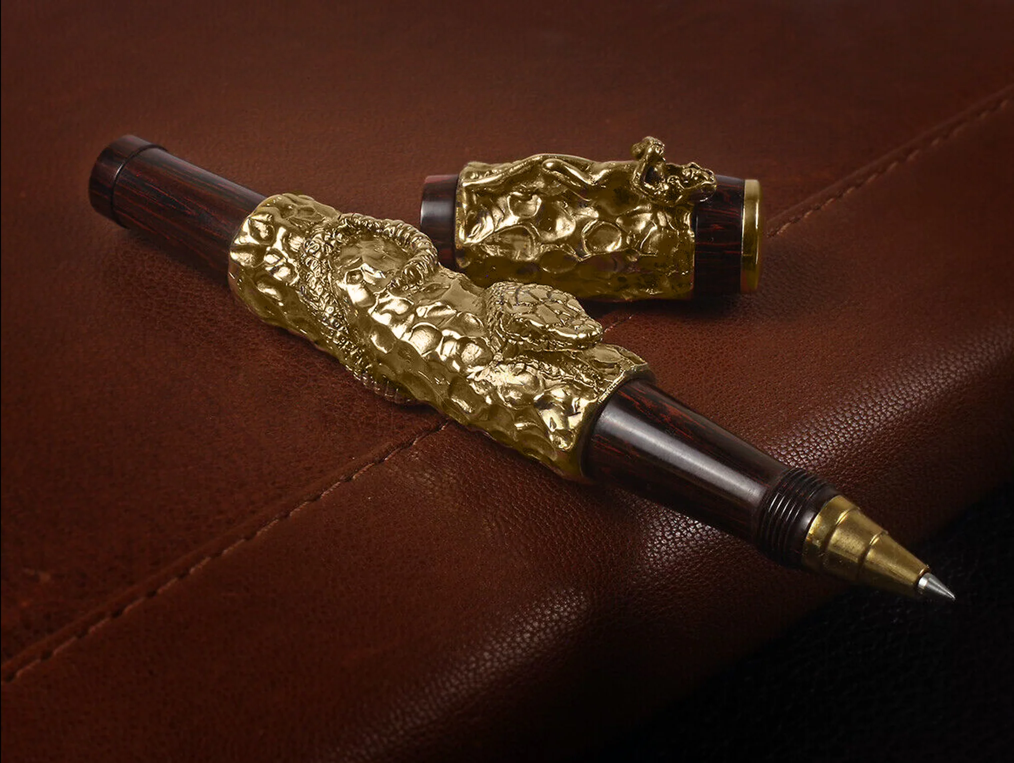Writing Mode: Rollerball Cap: Vermeil (gold over solid silver) heavy casting over ebonite. Barrel: Vermeil (gold over solid silver) heavy casting over ebonite. Of a one-of-a-piece creation. It is housed in a wooden pen presentation box with a leather pen case.