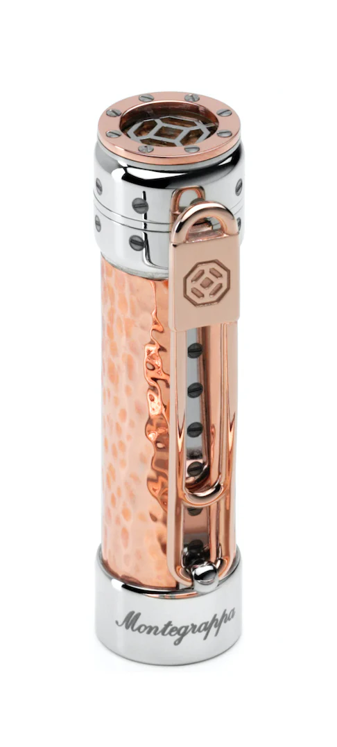 Montegrappa’s technicians executed hand-applied hammering techniques on the copper components, while tiny screws – both functional and ornamental – remind the user of the technological inspiration of the product. Even the pocket clip continues the grappa-making theme, formed to recall the copper tubing used in the distilling process.