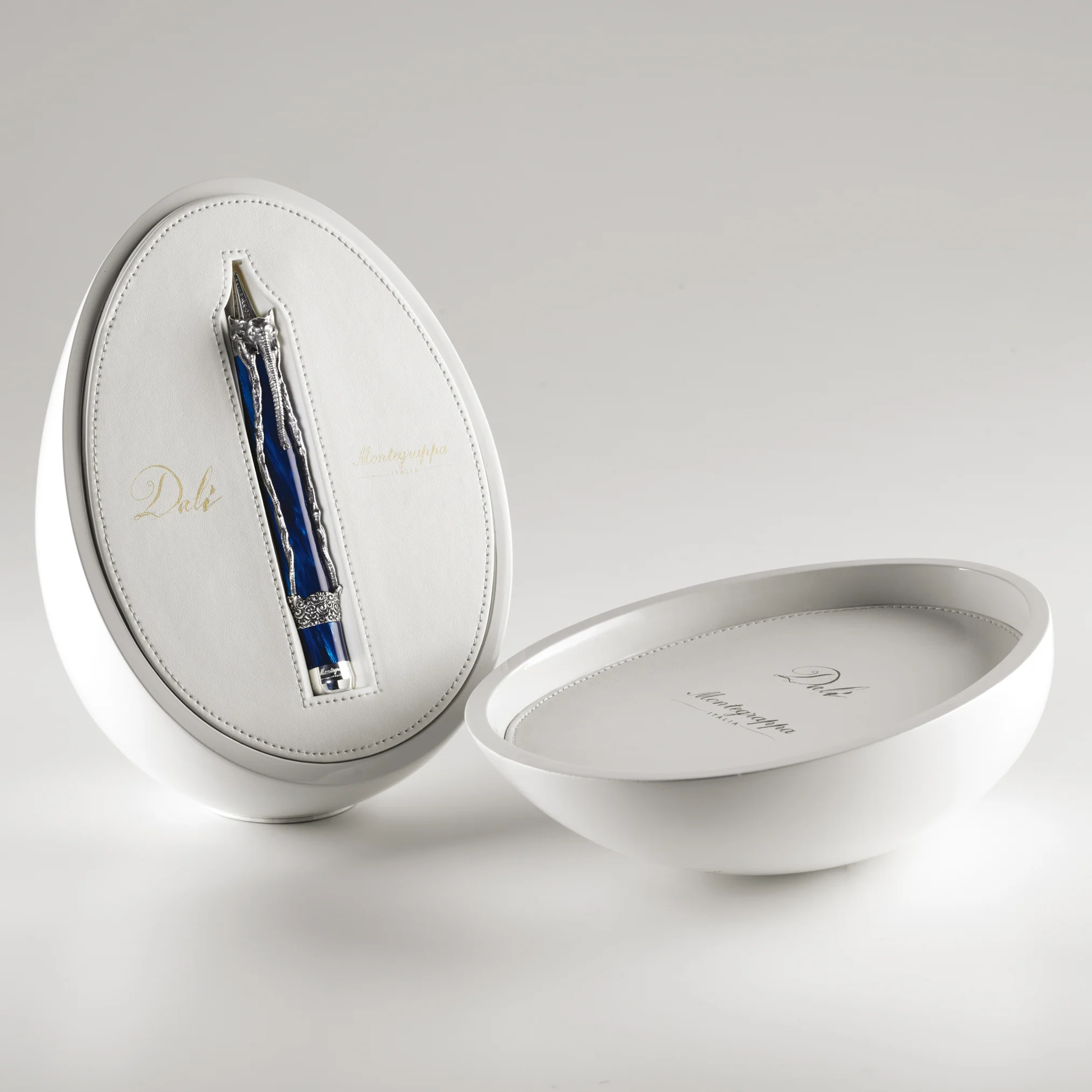 On the Montegrappa Fountain Pen Salvador Dali Limited Edition, the elephant embraces a barrel of Mediterranean blue celluloid for the silver edition or in malachite green for the solid gold version, the same way that the cap embraces the whole body of the pen. When the pen is opened, a quote from the autobiography, The Secret Life of Salvador Dali, is shown on the inner barrel.