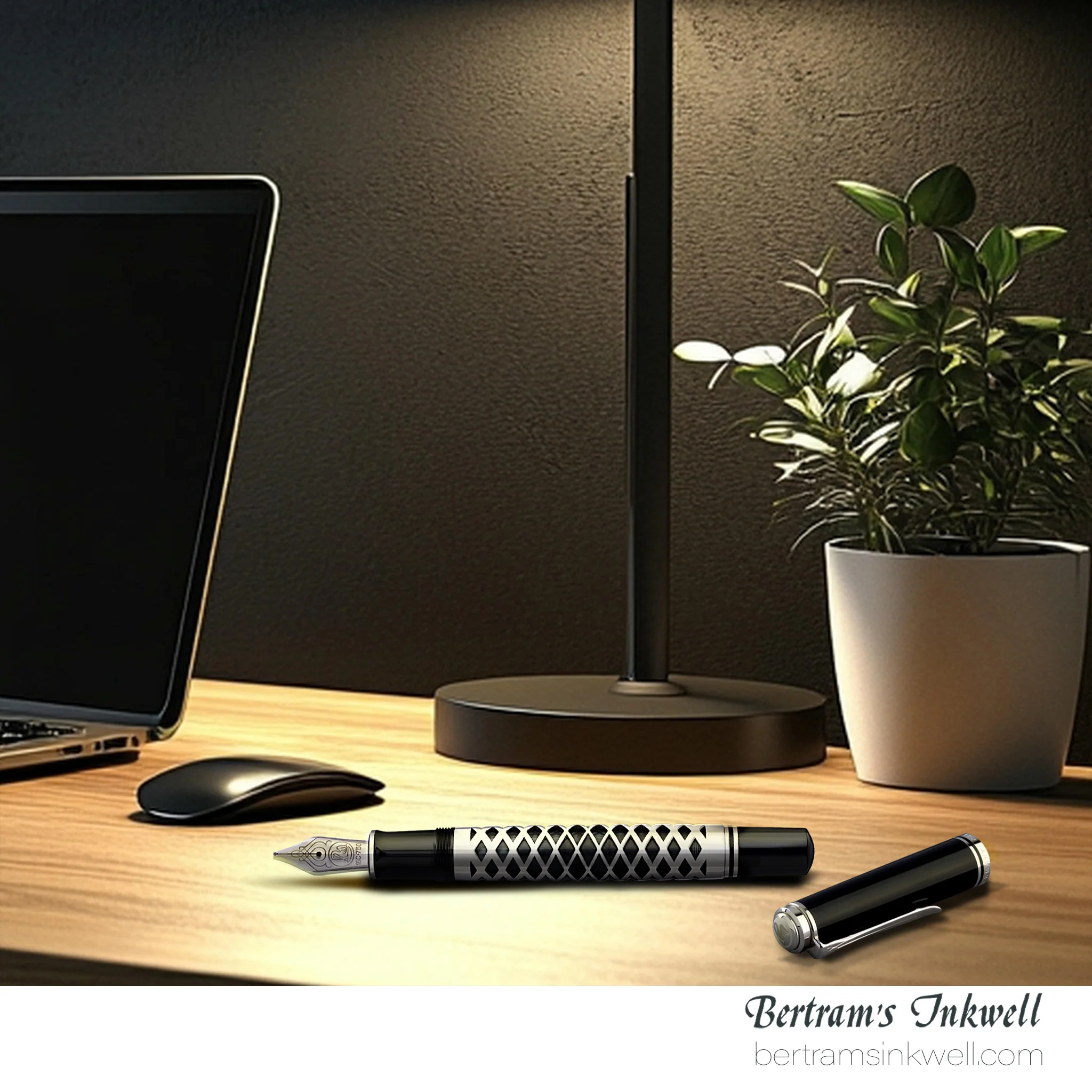At the core of the M805 Metal Sleeve is a polished black acrylic barrel, expertly fitted with a laser-cut silver metal sleeve. This intricately patterned overlay delivers an exceptional contrast of surfaces—smooth acrylic and detailed metal—giving the pen a bold, geometric look and a unique tactile experience. It's a statement piece with a modern, industrial edge, designed to stand out.