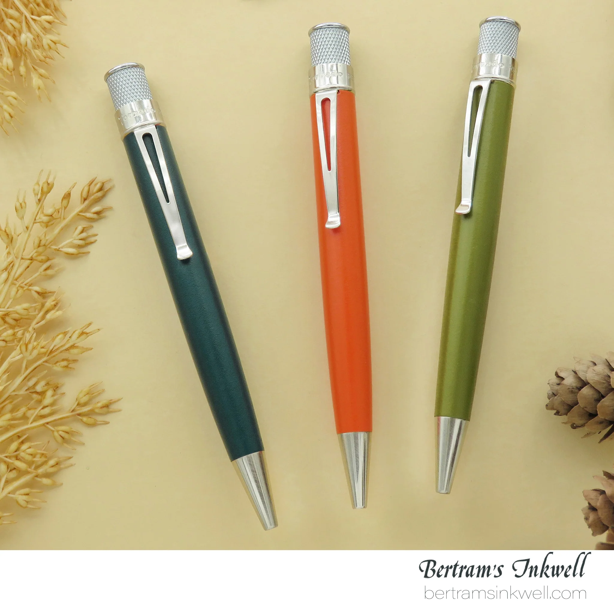 Fall into three new exciting colors: Juniper Green, Autumn Orange, and Dusk Blue. Each Seasonal Touch features a lightly textured lacquer barrel with a matte finish that is complete with a new trim - brushed chrome. The tactile feel provides extra grip in hand while the Fall colors are eye-catching for a multi-sensory delight. Each color’s top disc matches the barrel and they are packaged in Retro graphic tubes. Whether you are going back to school, looking to spice up your writing or pining for a new pen, these Seasonal Tornados are like a refreshing Autumn breeze.